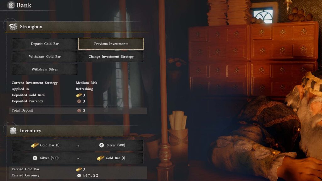 Αρκετά νωρίς στο παιχνίδι, κάποιοι ίσως παρατηρήσουν το bank system και την δυνατότητα επένδυσης gold bars. Ουσιαστικά, κάθε 500 silvers που έχεις πάνω σου αντιστοιχούν σε ένα gold bar. Αν θέλεις, μπορείς να κάνεις το trade (500 προς 1) μέσω του banker και στην συνέχεια να του εμπιστευτείς το gold bar ως επένδυση. Μετά από λίγη ώρα, αυτή η επένδυση μπορεί είτε να βγάλει κέρδος, είτε χασούρα. Ένα tip είναι να κάνεις save πριν ξεκινήσεις τις επενδύσεις, ώστε αν γράψεις χασούρα, να κάνεις load και να ξανά προσπαθήσεις. Χωρίς να σου κάνω spoil, στην πρώτη πόλη, υπάρχει ένα μέρος που μπορείς να αποκτήσεις ένα gold bar, για να ξεκινήσεις τα πρώτα σου βήματα ως επενδυτής.