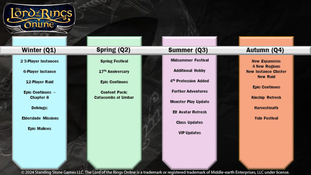 Σύμφωνα με τον Orion, έχει να πέσει πολλή δουλειά μέσα στο έτος, για το LotRO. Την προηγούμενη χρονιά, η Standing Stone Games, κατάφερε να ολοκληρώσει πολλές από τις υποσχέσεις της και όσα δεν έγιναν, έρχονται μέσα στο 2024. Μεταξύ άλλων, μία σημαντική υπόσχεση είναι το γεγονός πως θα έρθει ακόμα περισσότερο content, όπως νέα instances και raids, ένα “Αnniversary“ event και άλλα. Επίσης, πρόκειται να γίνει ένα φρεσκάρισμα στα Elf.