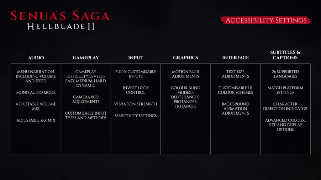 Η Ninja Theory ανακοίνωσε επίσημα τις εκτενείς επιλογές προσβασιμότητας για το πολυαναμενόμενο action-adventure sequel τους, Senua’s Saga: Hellblade 2, το οποίο κυκλοφορεί αύριο. Αυτή η είδηση έρχεται μετά από επτά χρόνια αναμονής και το studio μοιράστηκε τις πληροφορίες σε μια ανάρτηση στο X (πρώην Twitter), τονίζοντας τα χαρακτηριστικά του παιχνιδιού σε διάφορους τομείς όπως ήχος, gameplay, γραφικά και άλλα.