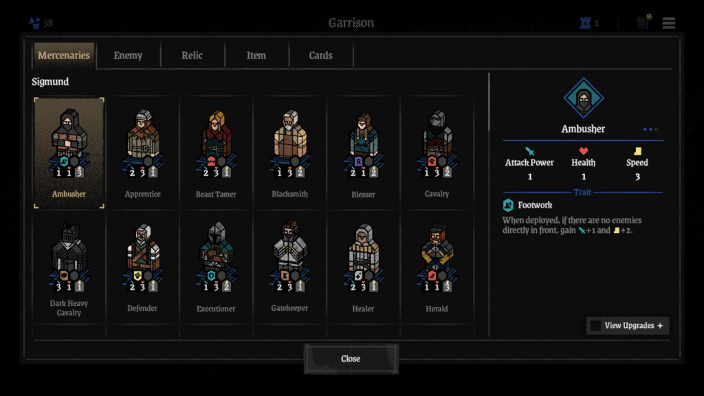 Κάτι άλλο που μου άρεσε αρκετά, είναι ο τρόπος με τον οποίο εξελίσσονται οι mercenaries. Κάθε μονάδα ξεκινά σχετικά αδύναμη, με βασικά στατιστικά επίθεσης, ζωής και ταχύτητας. Ωστόσο, μέσα από αναβαθμίσεις, traits και “rumors”, μπορεί να μετατραπεί σε κεντρικό πυλώνα ολόκληρης της στρατηγικής σου. Αυτή η αίσθηση σταδιακής ενδυνάμωσης είναι ιδιαίτερα ικανοποιητική, γιατί δεν έρχεται αυτόματα, αλλά ως αποτέλεσμα συνειδητών επιλογών.