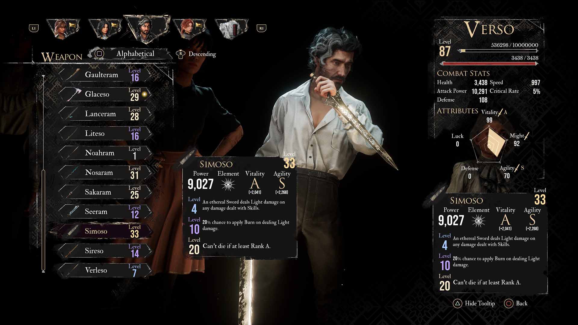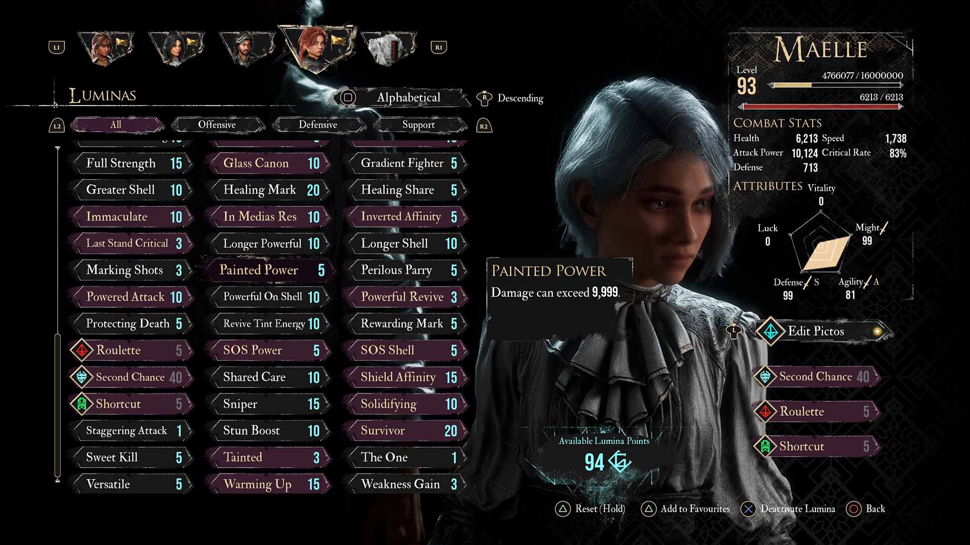 Οι βετεράνοι των RPG θα βρουν πολλά να αγαπήσουν στο σύστημα ανάπτυξης χαρακτήρων του Clair Obscur. Κάθε μέλος του party μπορεί να εξοπλιστεί με τρία Pictos, αντικείμενα που παρέχουν τόσο bonus στατιστικών όσο και παθητικές δεξιότητες. Μετά από αρκετές μάχες, η συνδεδεμένη παθητική δεξιότητα γίνεται Lumina, το οποίο μπορεί στη συνέχεια να τοποθετηθεί σε άλλους χαρακτήρες με βάση τους διαθέσιμους Lumina πόντους.