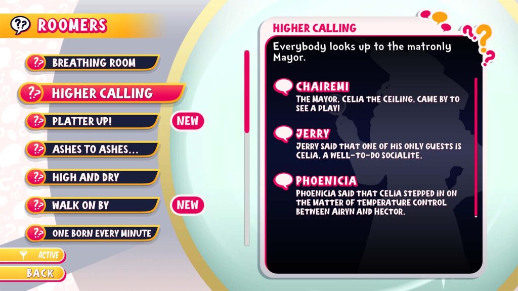Υπάρχει ένα app μέσα στο παιχνίδι, το “Roomers”, που λειτουργεί ως οδηγός, σαν dating tracker, για να σου δείξει ποιοι σε περιμένουν να τους ανακαλύψεις. Αυτό προσθέτει μια δόση εξερεύνησης, που ξεφεύγει από τον απλό κύκλο “διάλογος -> επιλογή -> επόμενο ραντεβού”.
