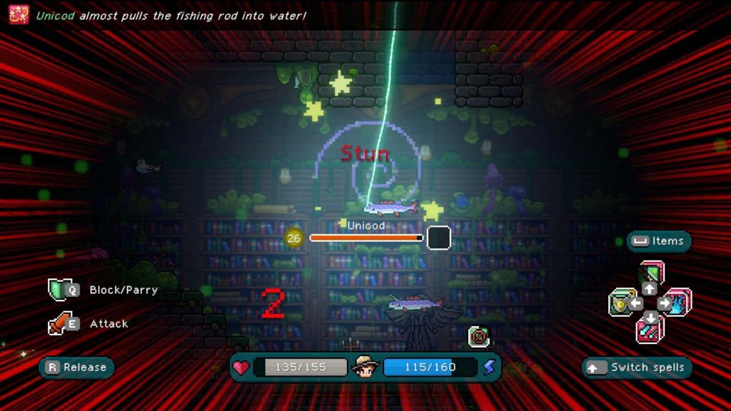 Η μάχη με τα ψάρια θυμίζει ένα αφηρημένα light version παιχνιδιών τύπου Dark Souls (δεν είναι τόσο δύσκολο, προφανώς), μιας και απαιτεί συγκέντρωση, ρυθμό και κατανόηση των μοτίβων. Τα parry, τα block και τα spells δημιουργούν ένα γοητευτικό loop, όπου κάθε επιτυχημένο ψάρεμα αποτελεί μια σημαντική νίκη.