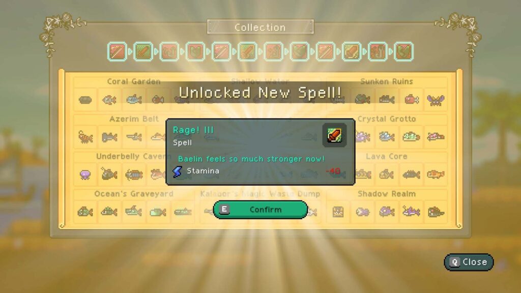 Το παιχνίδι επιβραβεύει την πρόοδο με νέο εξοπλισμό, αντικείμενα, καπέλα(!) και αποστολές. Το κάθε κομμάτι εξοπλισμού δεν καθορίζει απλά τα στατιστικά, αλλά μας επιτρέπει να “χτίσουμε” ένα “class” που θέλουμε για τον Baelin: επιθετικός, αμυντικός, υποστηρικτικός. Δεν στο λέει ξεκάθαρα, αλλά ουσιαστικά σε αφήνει να “φτιάξεις” builds με βάση τις επιλογές σου σε δολώματα, καπέλα, δαχτυλίδια και skills.